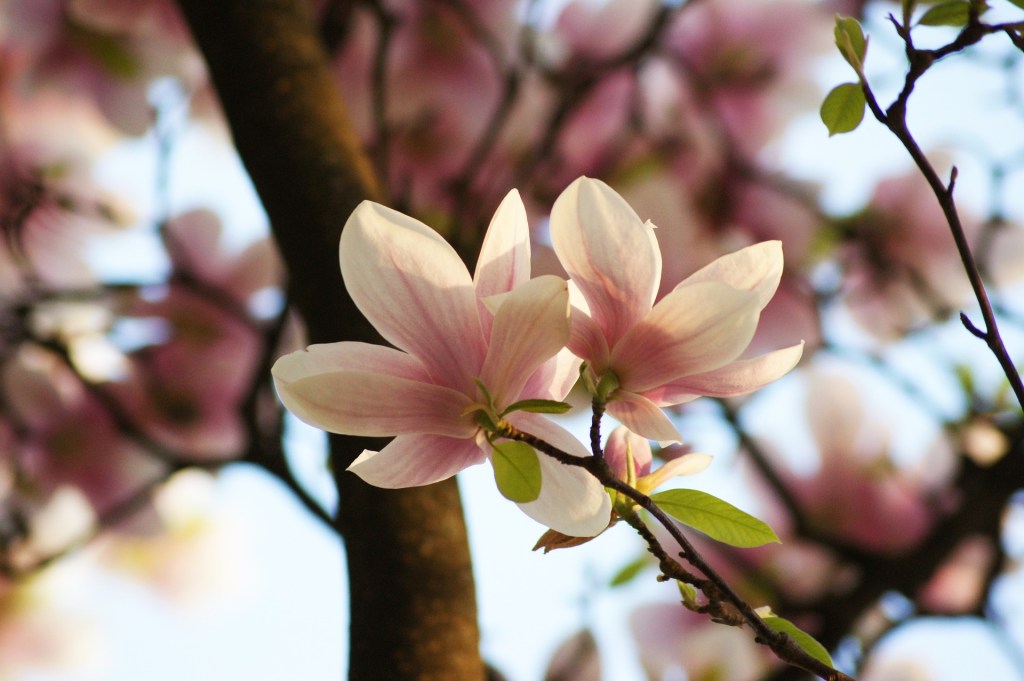 A magnolia tree’s leaves are too thick to see the clouds in the sky, so instead we look at globs of leaves. I think all of them are birds, but she thinks they’re all flowers. One of us always tries to take flight, the other is always rooted in the ground.